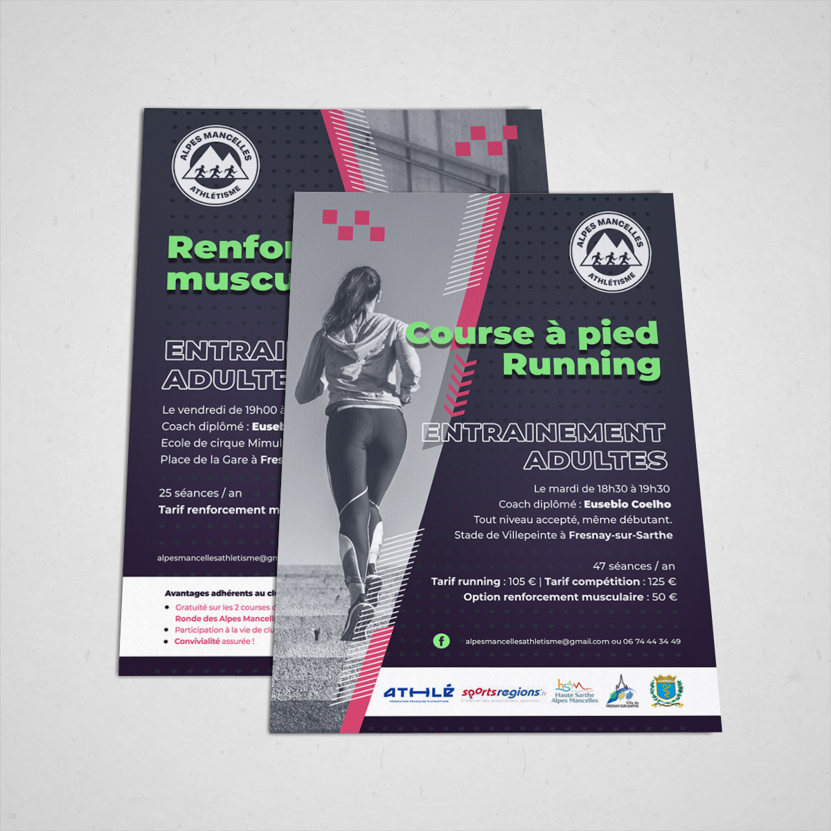 Conception graphique des flyers pour les cours de running adultes du club d’athlétisme de Fresnay-sur-Sarthe.